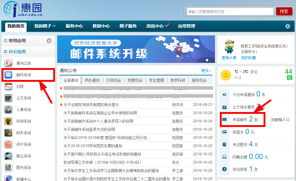 第一步,登录“i惠园”信息平台,点击“未读邮件X封”按钮,或者左侧“办公应用”列表中的“邮件系统”应用。
